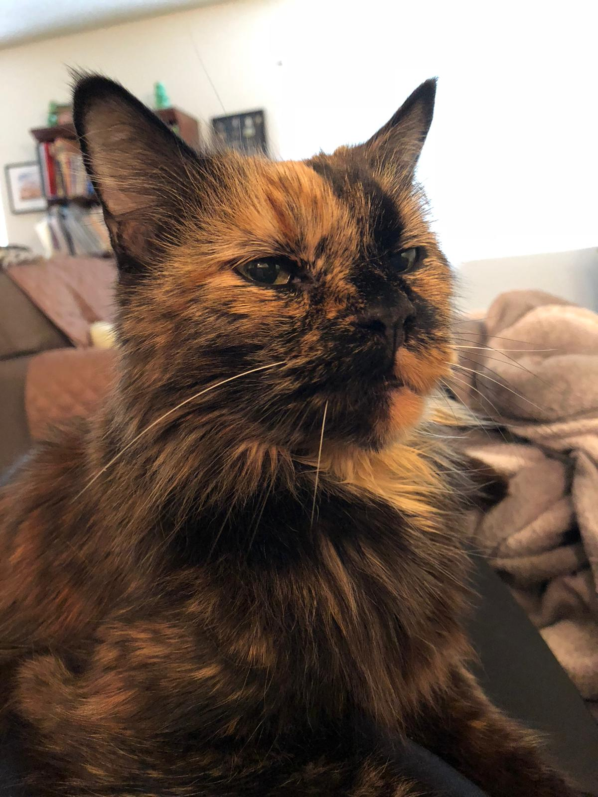 Sometimes she has boogers on her nose. Housecats sometimes have this, especially when they are old and in a new environment, like she is. For a couple days I was tasked with wiping the boogers off her face. She was too dignified to let me, though, and pretended they weren’t there, even if it meant sniffling all day.